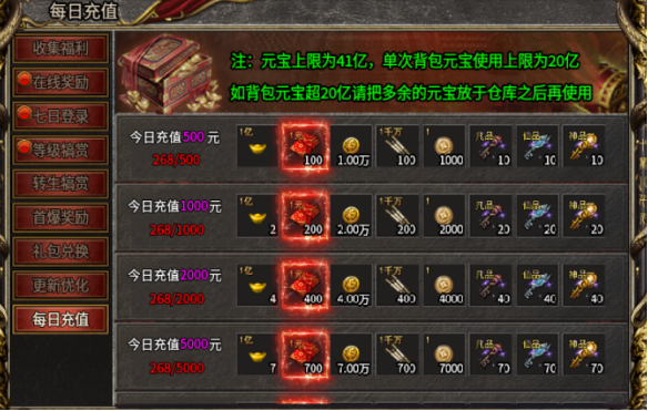 单日:30元 礼包:3千万元宝,1元红包*30,西游币*3000,1000万经验卷*30,跨服币*300,凡品钥匙*3,仙品钥匙*3,神品钥匙*3 单日:98元 礼包:5千万元宝,1元红包*50,西游币*5000,1000万经验卷*50,跨服币*500,凡品钥匙*5,仙品钥匙*5,神品钥匙*5 单日:198元 礼包:7千万元宝,1元红包*70,西游币*7000,1000万经验卷*70,跨服币*700,凡品钥匙*7,仙品钥匙*7,神品钥匙*7 单日:500元 礼包:1亿元宝,1元红包*100,西游币*10000,1000万经验卷*100,跨服币*1000,凡品钥匙*10,仙品钥匙*10,神品钥匙*10 单日:1000元 礼包:2亿元宝,1元红包*200,西游币*20000,1000万经验卷*200,跨服币*2000,凡品钥匙*20,仙品钥匙*20,神品钥匙*20 单日:2000元 礼包:4亿元宝,1元红包*400,西游币*40000,1000万经验卷*400,跨服币*4000,凡品钥匙*40,仙品钥匙*40,神品钥匙*40 单日:5000元 礼包:7亿元宝,1元红包*700,西游币*70000,1000万经验卷*700,跨服币*7000,凡品钥匙*70,仙品钥匙*70,神品钥匙*70 单日:10000元 礼包:15亿元宝,1元红包*1500,西游币*150000,1000万经验卷*1500,跨服币*15000,凡品钥匙*150,仙品钥匙*150,神品钥匙*150 单日:20000元 礼包:21亿元宝,1元红包*2100,西游币*210000,1000万经验卷*2100,跨服币*21000,凡品钥匙*210,仙品钥匙*210,神品钥匙*210